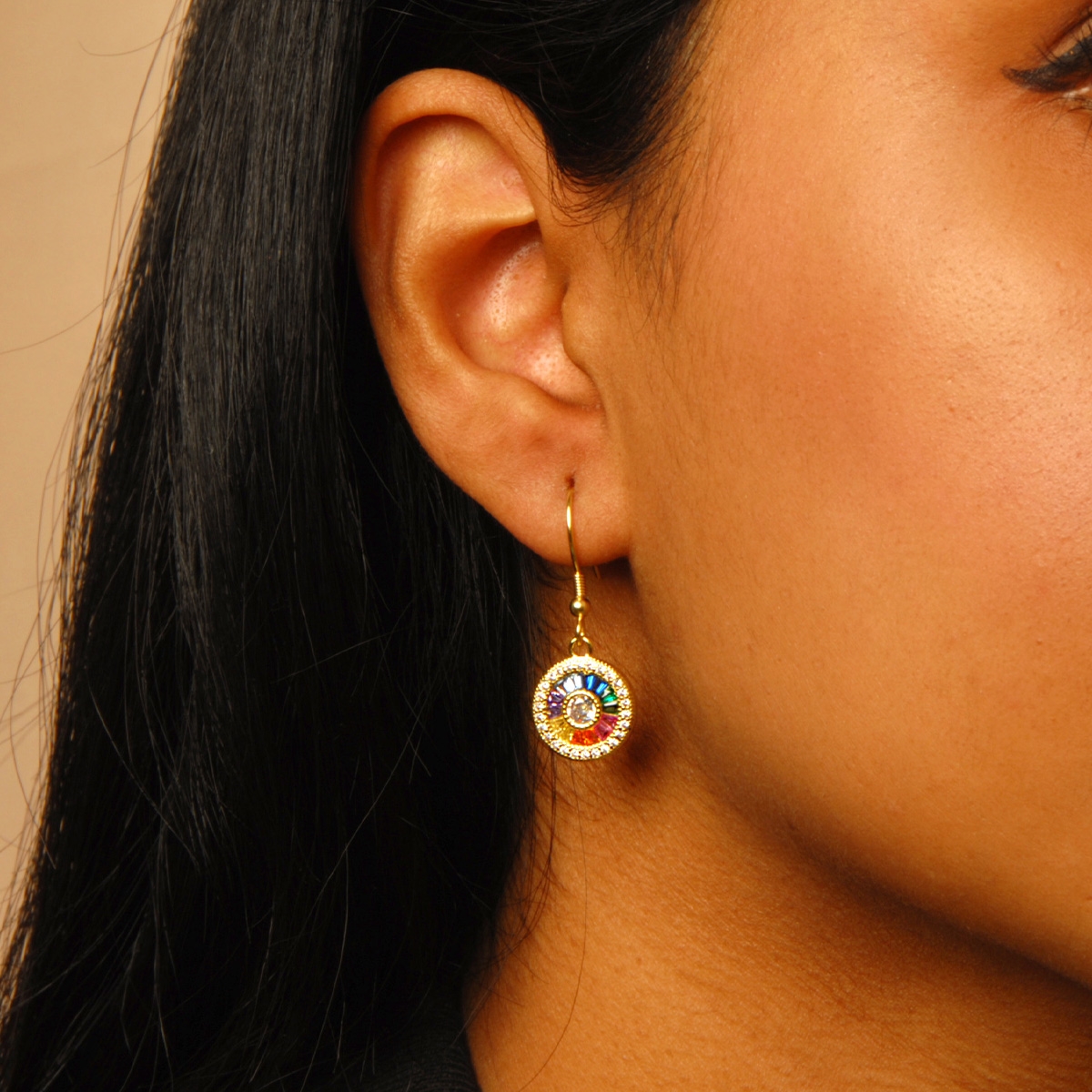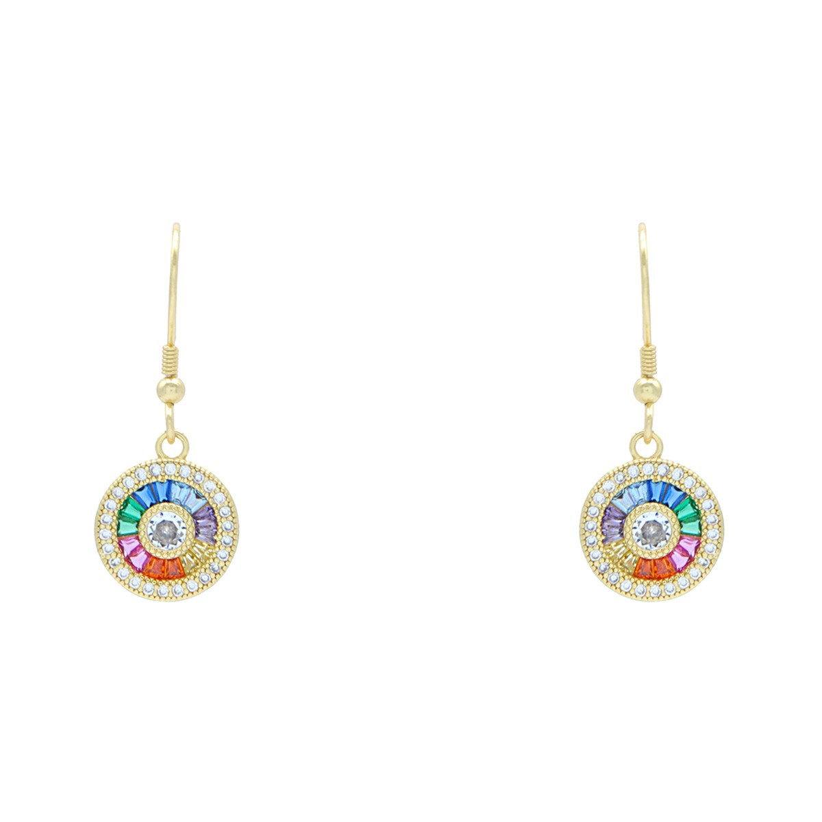 Bright and fresh fashion adds the perfect amount of confidence and fun to any outfit. Fifth Avenue Collection's "Blissful Colors" hook earrings exude breezy style with charming medallions of colorful AAA cubic zirconia baguettes surrounded by shimmering clear rounds. Sterling silver hooks. Nickel and lead free jewellery.