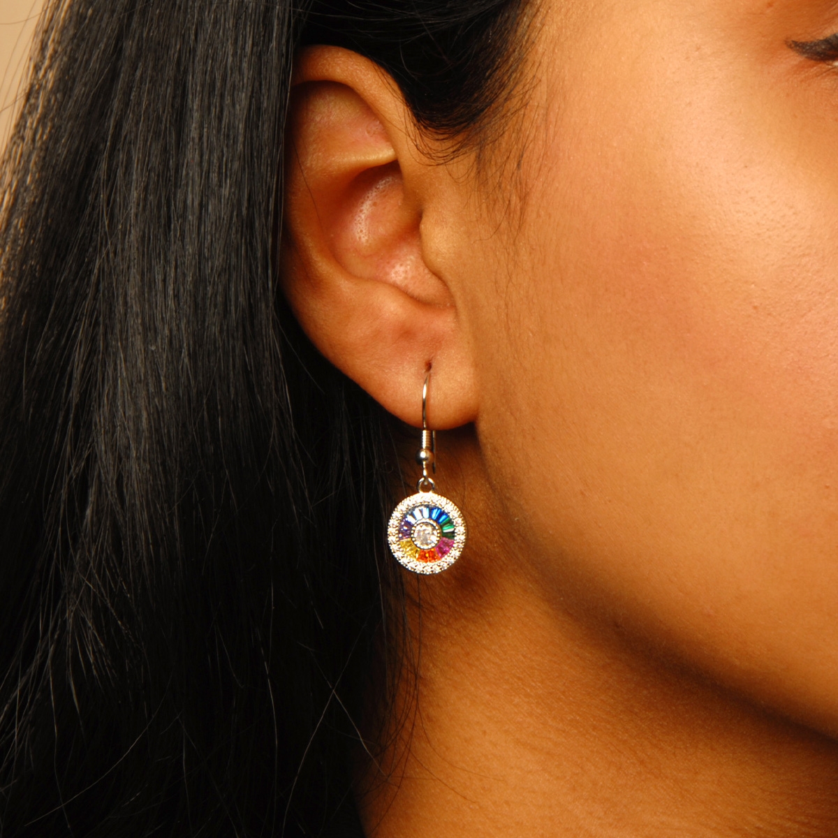 Bright and fresh fashion adds the perfect amount of confidence and fun to any outfit. Fifth Avenue Collection's "Blissful Colors" hook earrings exude breezy style with charming medallions of colorful AAA cubic zirconia baguettes surrounded by shimmering clear rounds. Sterling silver hooks. Nickel and lead free jewellery.
