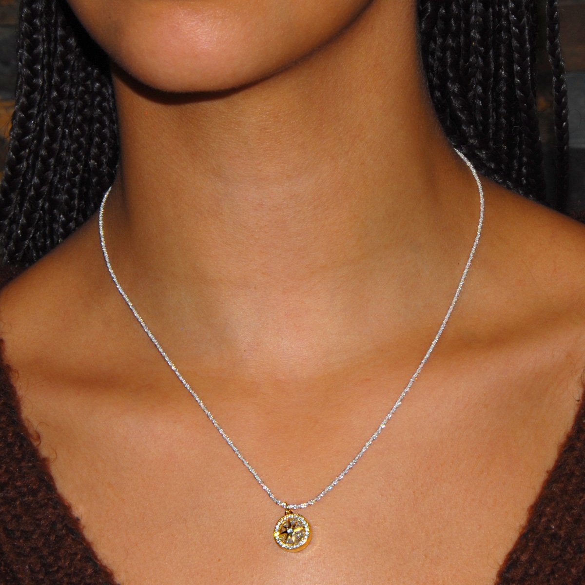 This beautiful two-tone star design encrusted with sparkling AAA cubic zirconia drops from a fine 16" designer chain to add that extra shimmer to your every outfit. Nickel and lead free jewellery.