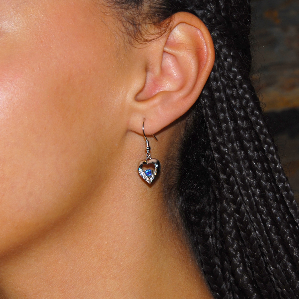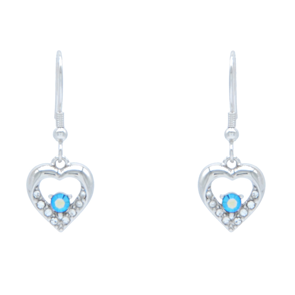 These beautiful rhodium finished earrings studded with brilliant sapphire and aurora borealis Swarovski crystal speak to your “Heart's Desire” as they drop softly from sterling silver hooks. Nickel and lead free jewellery.