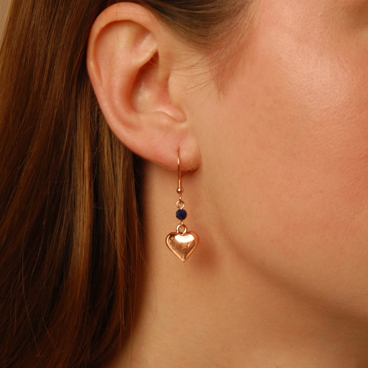 Our gorgeous "Love & Strength" earrings flaunt beautiful genuine lapis lazuli faceted beads and a smooth rose gold finished heart suspended from sleek sterling silver hooks. Lapis is known to harmonize your heart and your mind when worn, providing you with a very special and on-trend fashion accessory. Nickel and lead free jewellery.
