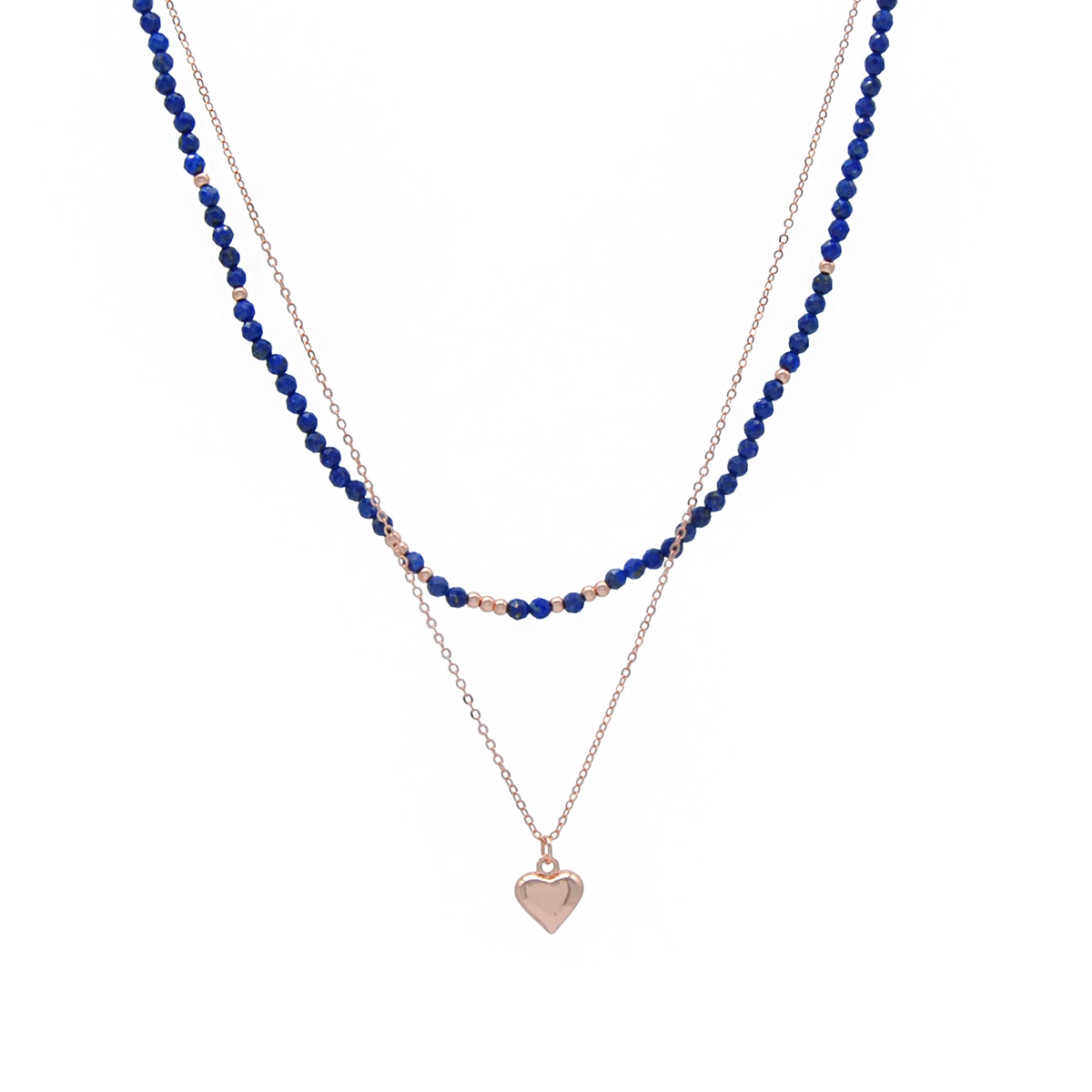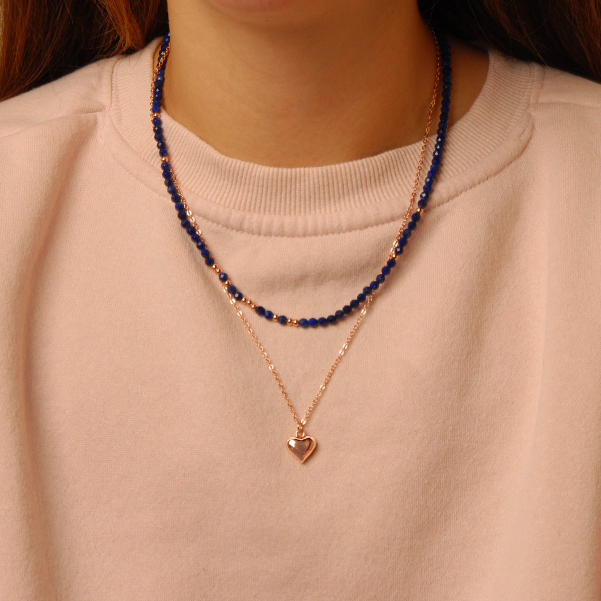 Our gorgeous "Love & Strength" neckpiece flaunts a beautiful strand of genuine lapis lazuli faceted beads combined with a sleek designer chain holding a smooth rose gold finished heart. Lapis is known to harmonize your heart and your mind when worn, providing you with a very special and on-trend fashion accessory. 17" neckpiece with 2" extension. Nickel and lead free jewellery.