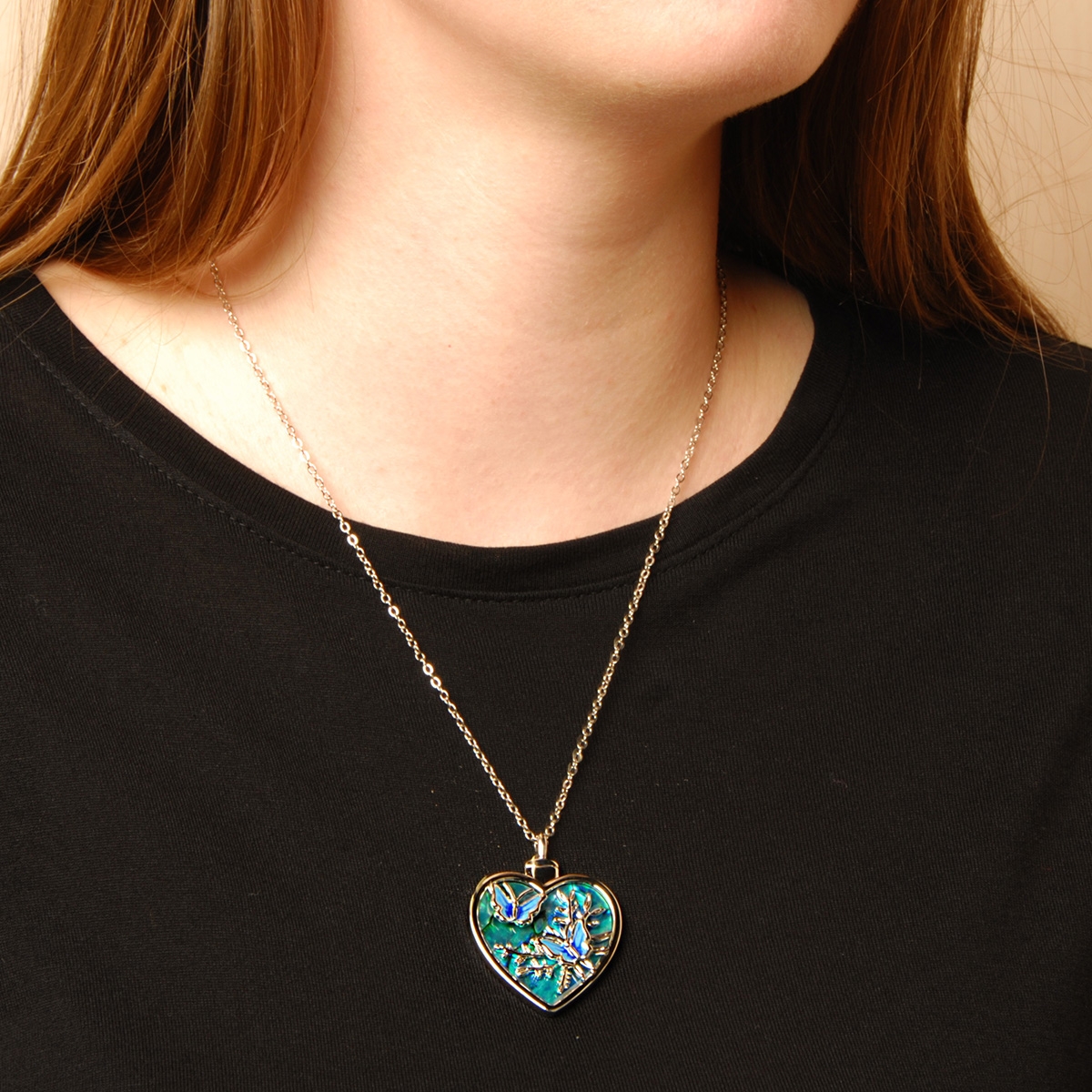 Immaculately designed, our "Luminous Flight" neckpiece flaunts a stunningly unique paua shell heart pendant accented with intricate hand-painted enamel butterflies, suspended from a sleek 19” designer chain to add a perfect touch of natural elegance to your look. Nickel and lead free jewellery.