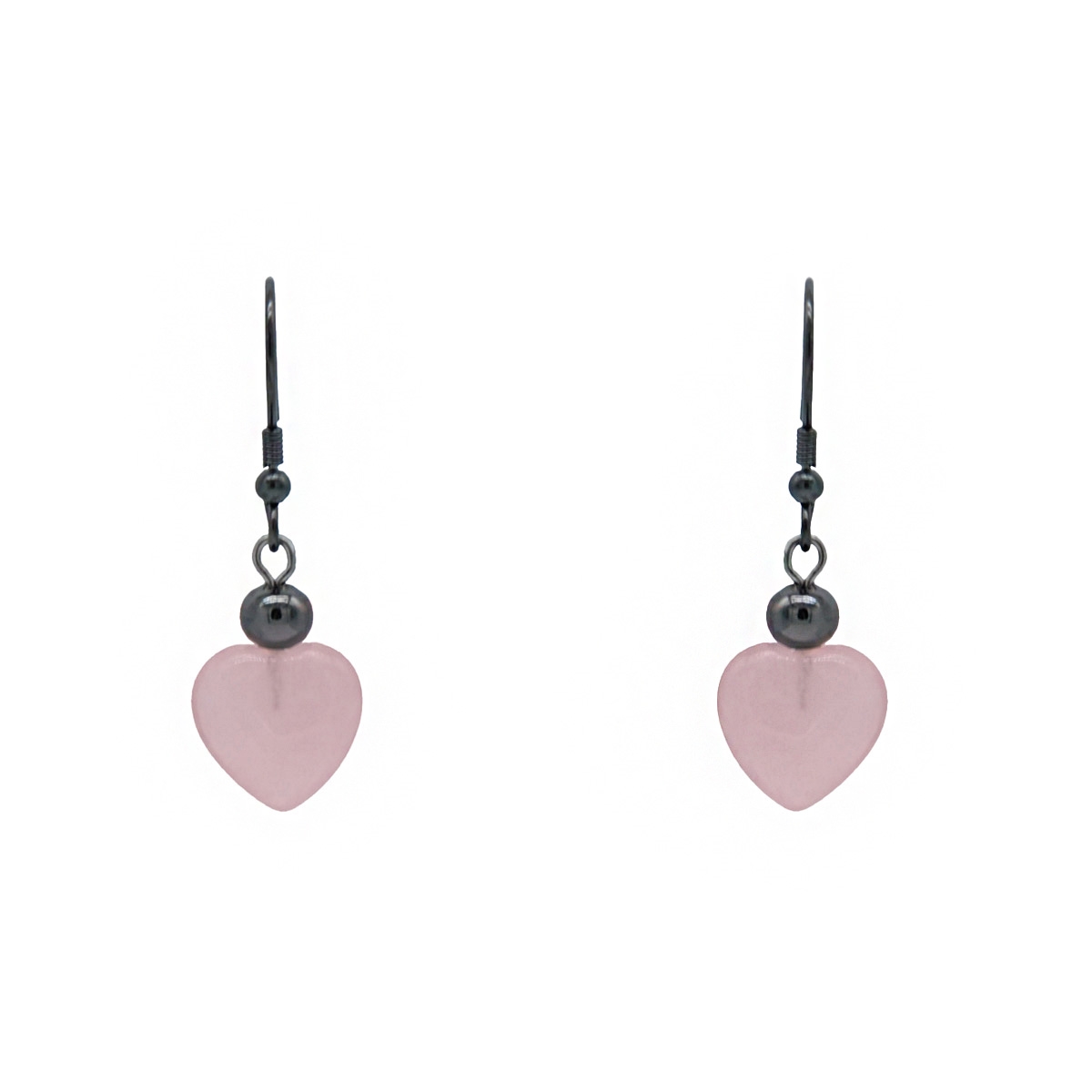 Known as the love stone, this stunning "Naturally Pink" design features calming and powerful natural rose quartz hearts on bold hematite finished sterling silver hooks. Nickel and lead free jewellery.