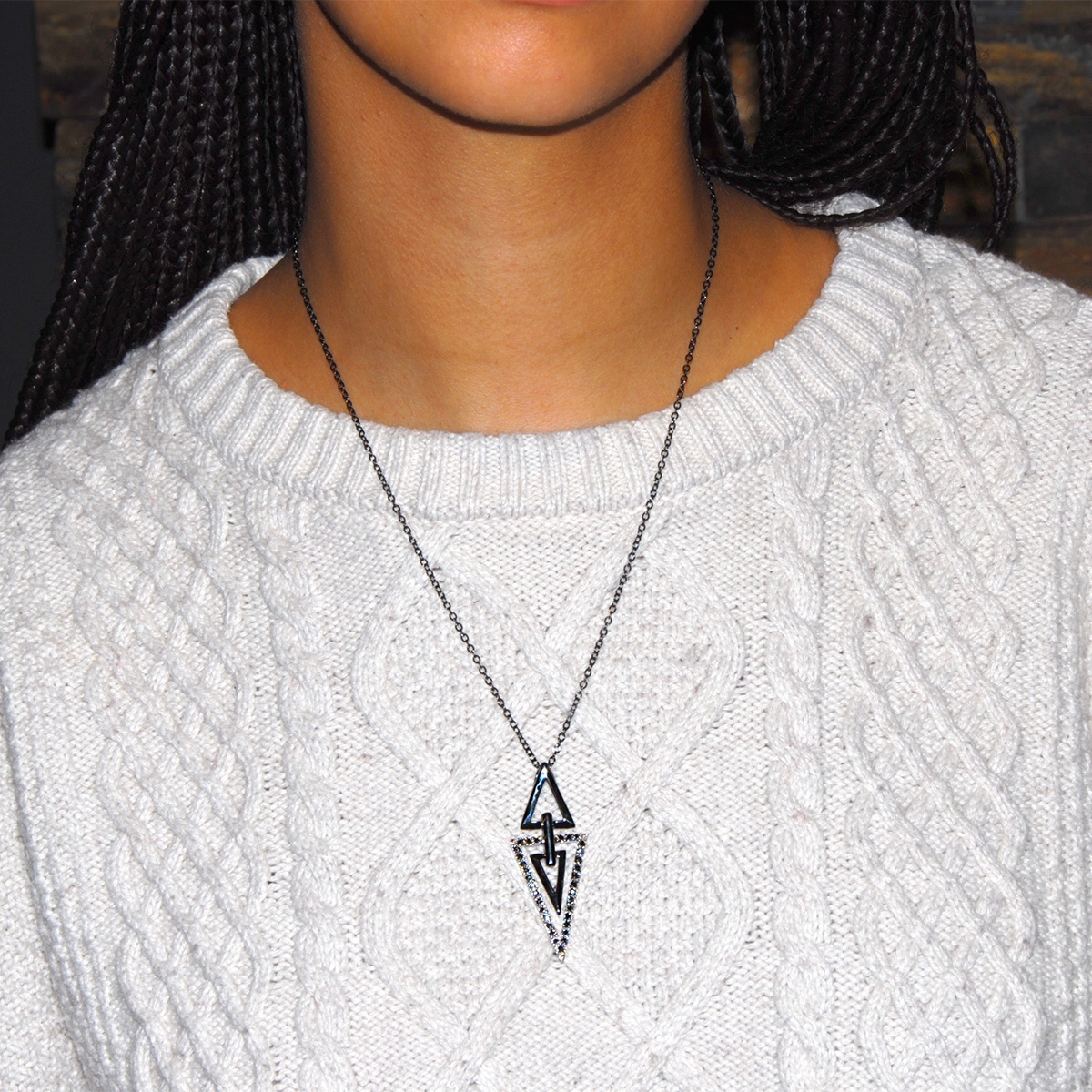Flaunt your style with our chic and flattering “Pointed Opulence” neckpiece. This stunning fashion accessory features a sleek, triangular design combining smooth, polished bars and sparkling Swarovski crystal on a sleek 19" designer chain. Nickel and lead free jewellery.
