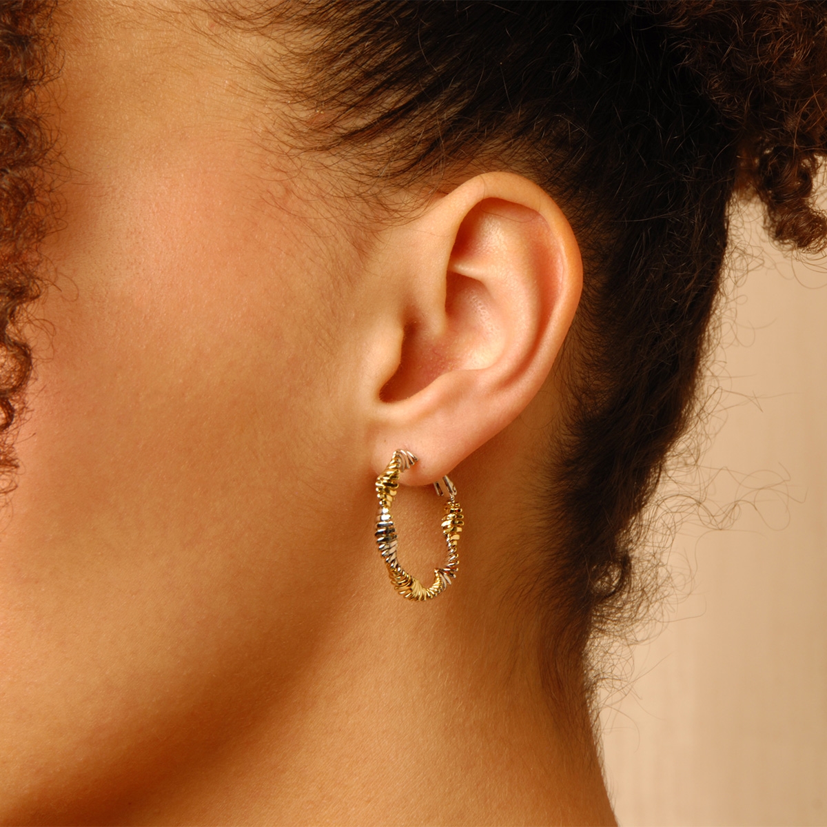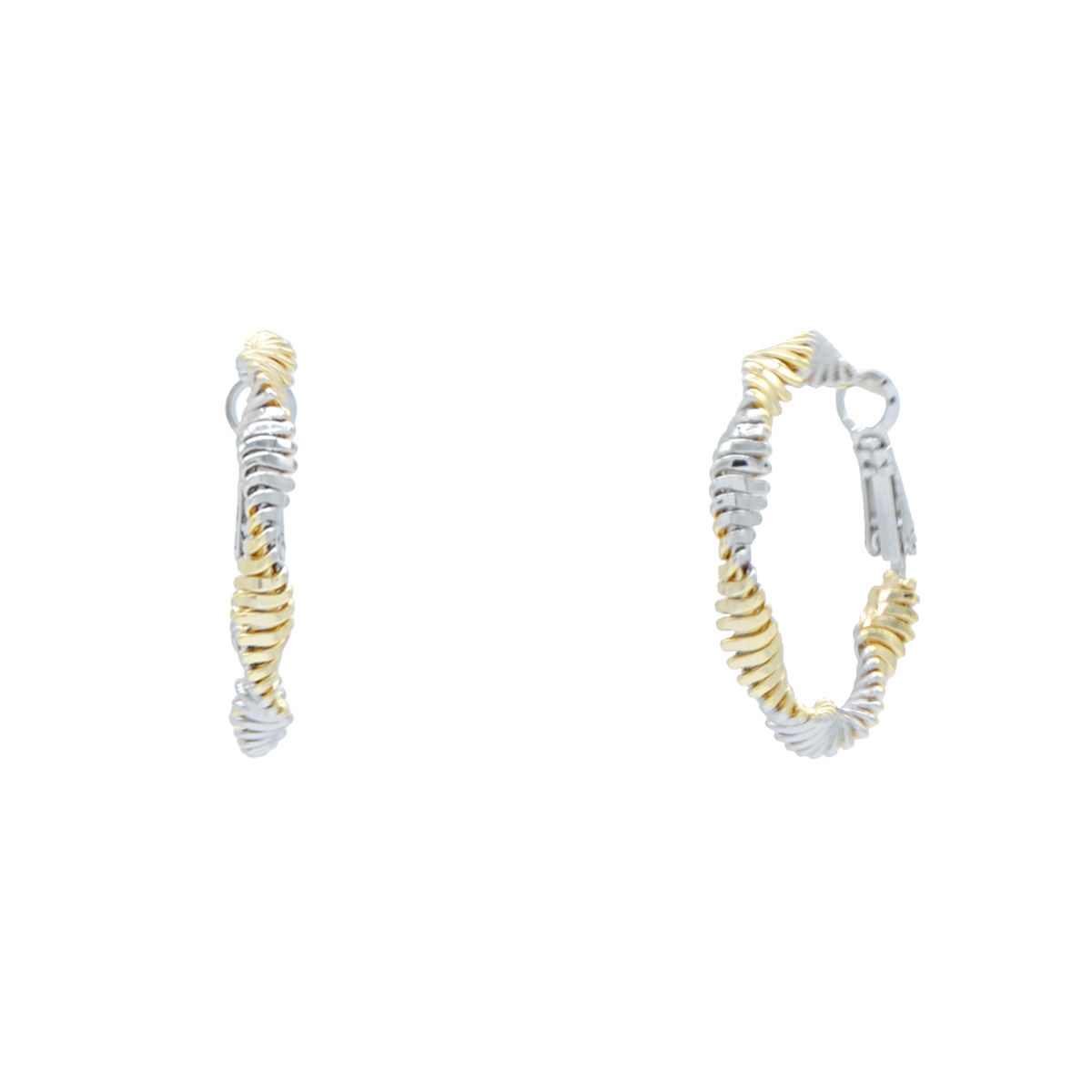 Flaunting a unique eye-catching twisted aesthetic, our "Pretty Curves" two-tone hoop earrings are the perfect fashion accessories to compliment your everyday look. Sterling silver posts. Nickel and lead free jewellery.