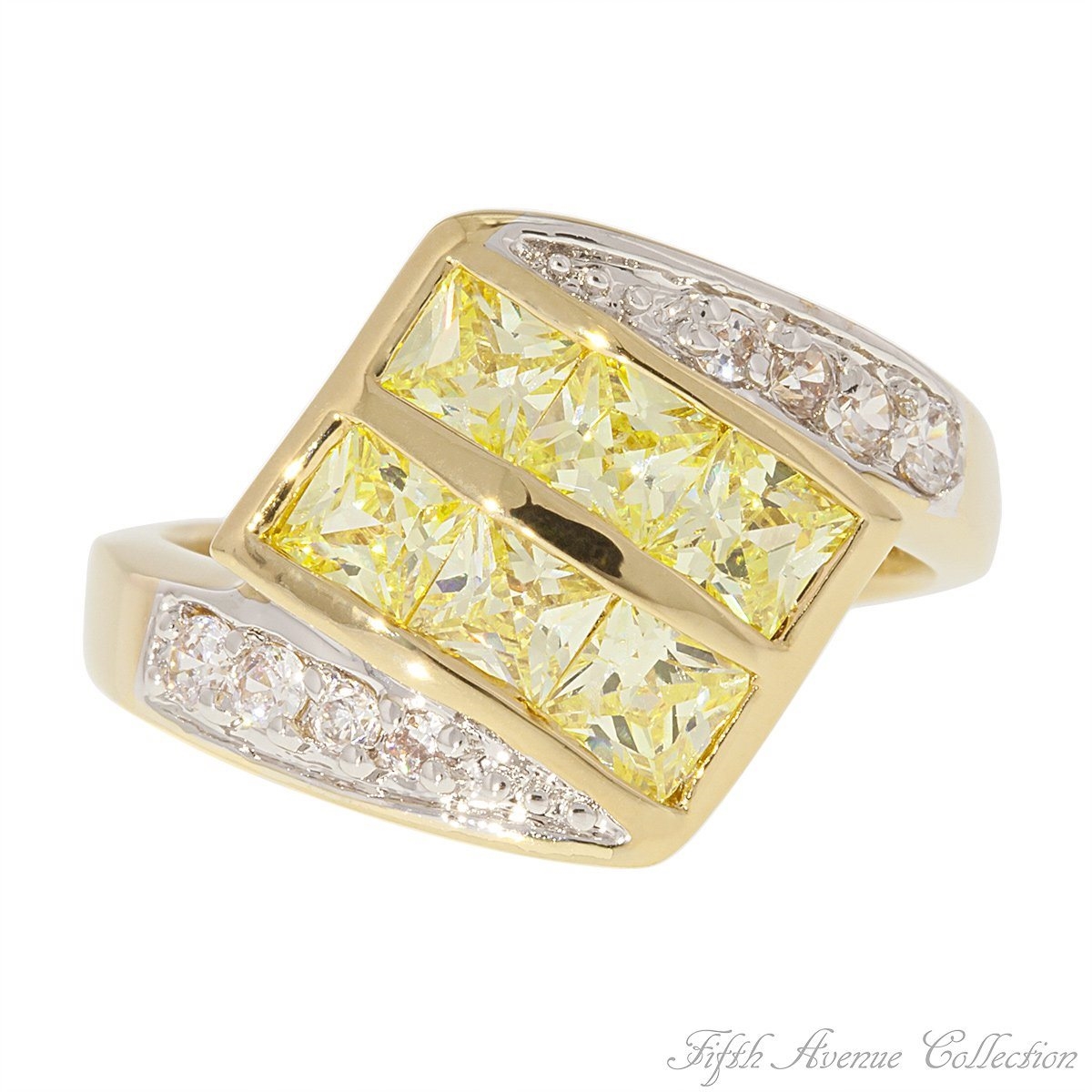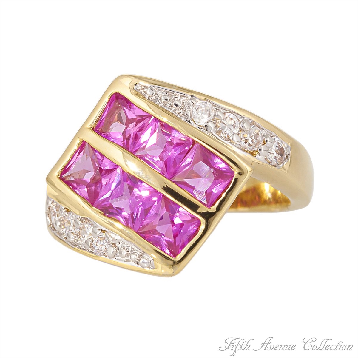 A ring so forthrightly beautiful, it's bound to bring sparkle wherever it's worn. Six princess cut triple A quality cubic zirconia are diagonally held in the arms of ten shimmering clears. Good things come in threes, take your choice of this season's fun new colours... fuchsia, aqua or jonquil.