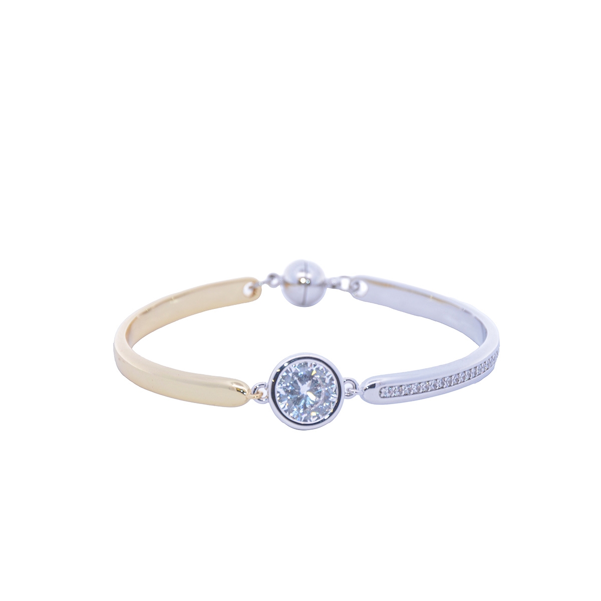Alone or in an arm-candy stack, this stunning "Spotlight Sparkle" bracelet, featuring a brilliant AAA cubic zirconia centerpiece accompanied by a row of sparkling rounds and a versatile two-tone finish, is the perfect addition to any look. Easy-to-wear magnetic ball closure. Nickel and lead free jewellery.