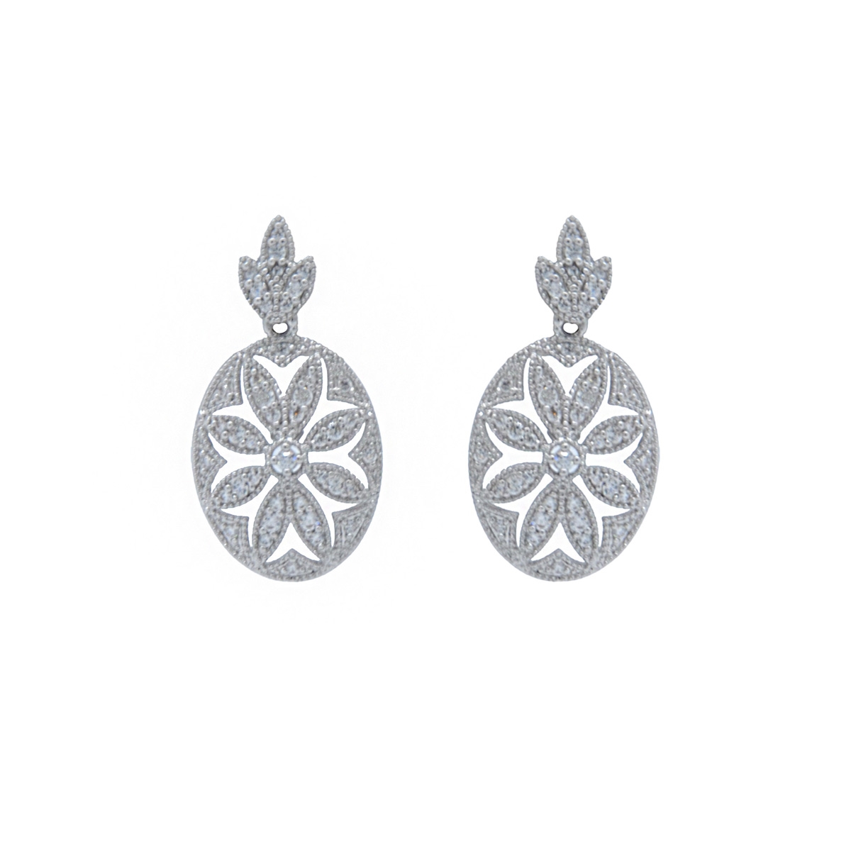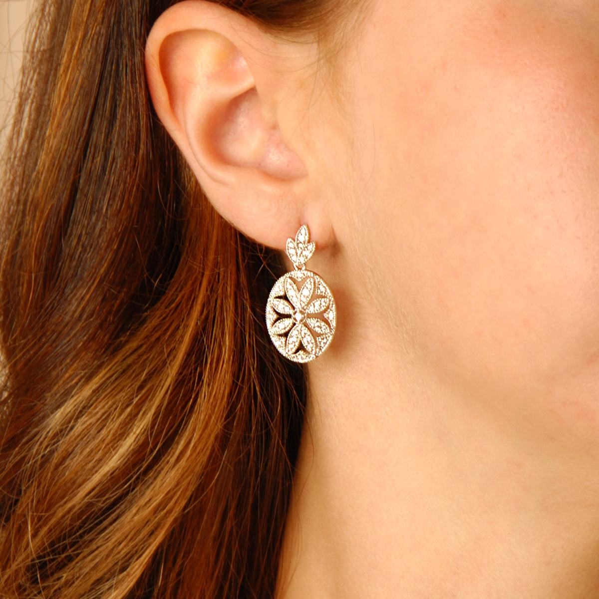Botanically inspired, our romantic "Vintage Florals" drop earrings are elegantly designed showcasing beautiful AAA cubic zirconia. Sterling silver posts. Nickel and lead free jewellery.