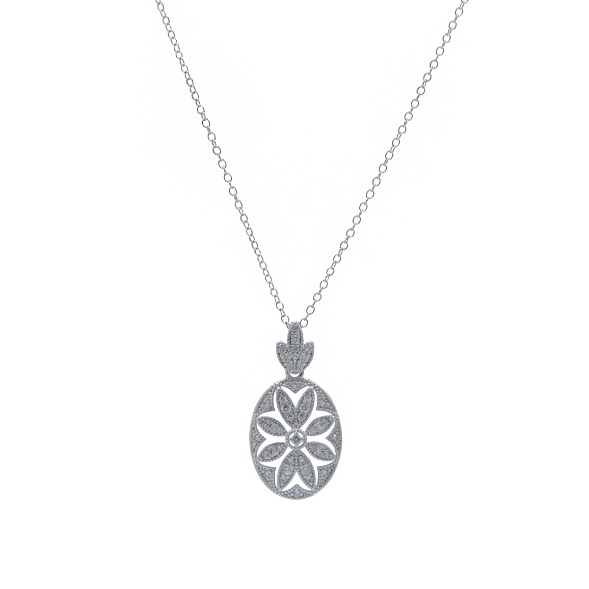 Botanically inspired, our romantic "Vintage Florals" neckpiece is elegantly designed showcasing a beautiful AAA cubic zirconia studded pendant on a sleek 18" designer chain. Nickel and lead free jewellery.